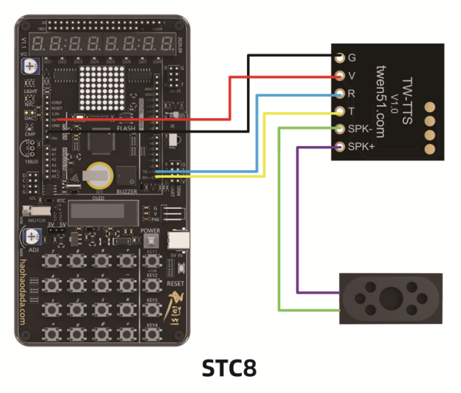 3、STC8如何使用TW-TTS语音合成模块硬件连接 这里我们使用默认UART3,P5_1和P5_0引脚。STC8的P5_1(TX)引脚接TW_TTS的(R)引脚,STC8的P5_0(RX)引脚接TW_TTS的(T)引脚。5V引脚接TW-TTS的(V)引脚,GND引脚接TW-TTS的(G)引脚。TW-TTS的SPK+和SPK- 分别连接喇叭的+(红线)和-(黑线)。 范例代码 (1)文本播报,天问五幺,你好; 实现效果:单片机上电自动播报:天问五幺,你好。