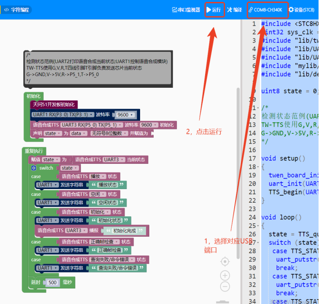 (5)实现效果:实时查询播报状态空闲和初始化通过TTS播报; 打开天问串口助手工具查看TW-TTS打印回复状态。