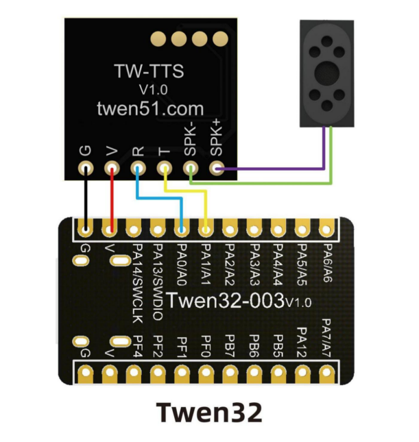 4、TW32F003如何使用TW-TTS语音合成模块硬件连接 这里我们使用串口二,即Serial2;TW32的PA0(TX)引脚接TW_TTS的(R)引脚,TW32的PA1(RX)引脚接TW_TTS的(T)引脚。V引脚接TW-TTS的(V),G引脚接TW-TTS的(V)引脚。TW-TTS的SPK+和SPK- 分别连接喇叭的+(红线)和-(黑线) 范例代码 (1)文本播报,天问五幺,你好; 实现效果:单片机上电自动播报:天问五幺,你好