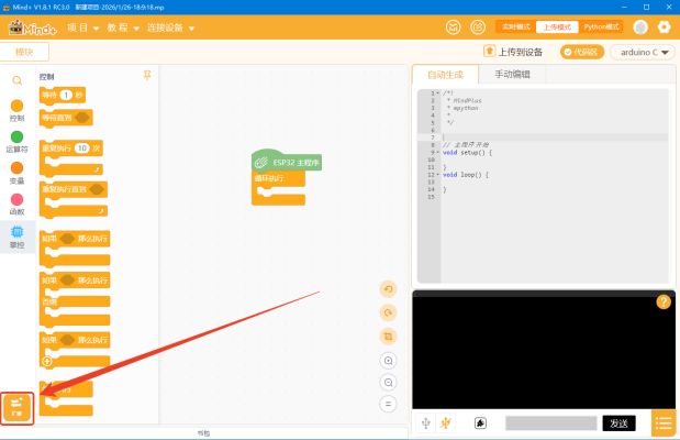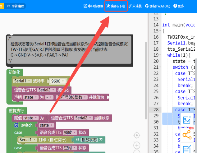 程序下载 代码完成后点击天问Block右上角的“编译”。