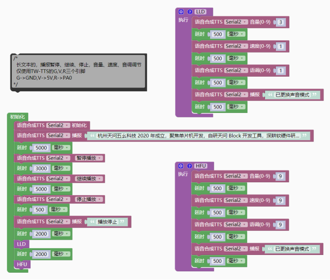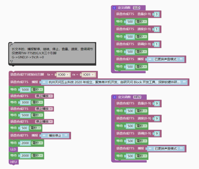 复制代码(2)长文本播报,展示暂停、继续、停止功能;展示音量、语速、语调的调节功能; 实现效果:上电自动播报长文本,每隔几秒钟依次展示暂停、继续、音量3语速1和语调1的短文本、音量9语速9语调9的短文本展示。 - #include <TW_TTS.h>