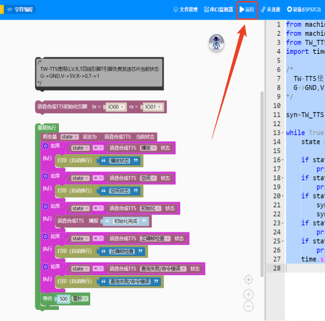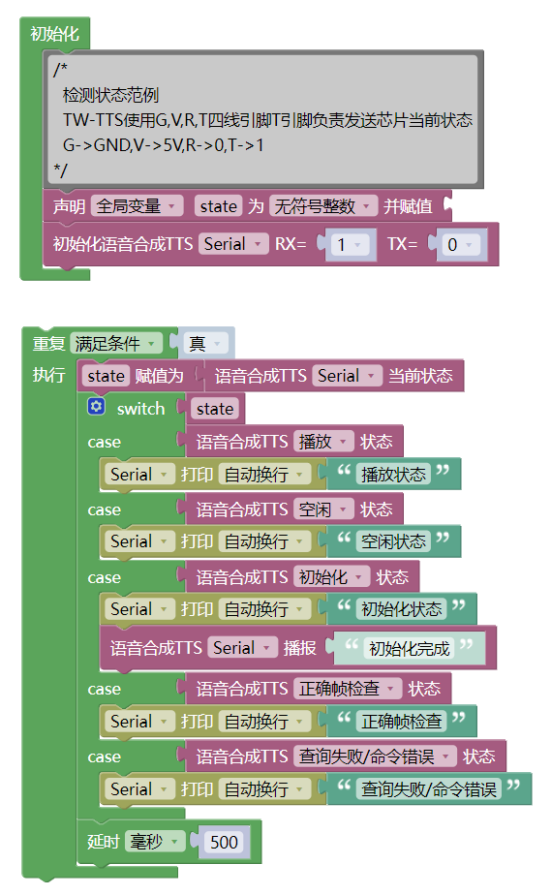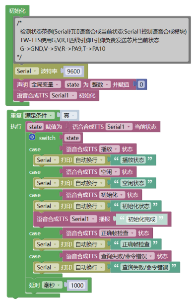 复制代码(5)实现效果:实时查询播报状态和正确帧检查并在串口打印,初始化完成通过TTS播报。 - #include <TW_TTS.h>