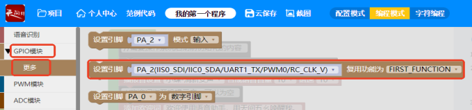 ASRPRO图形块中设置引脚需要将引脚设置为复用的串口功能。选择分类GPIO ->更多 -> 选择复用功能的图形块,并选择复用功能为FORTH FUNCTION。 范例代码 (1)文本播报,天问五幺,你好; 实现效果:单片机上电自动播报:天问五幺,你好 定义引脚时候要使用串口。