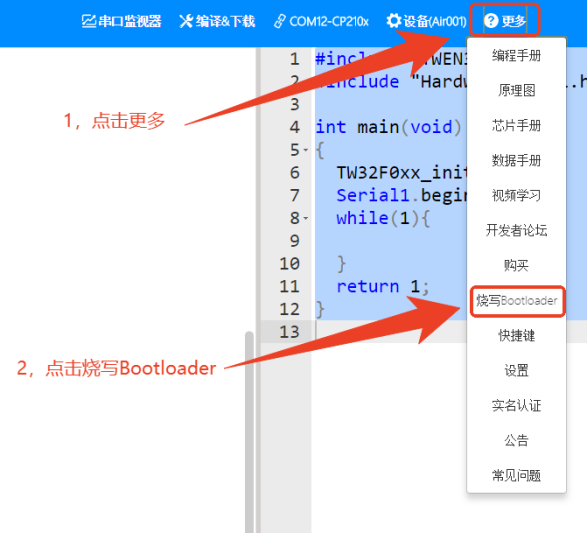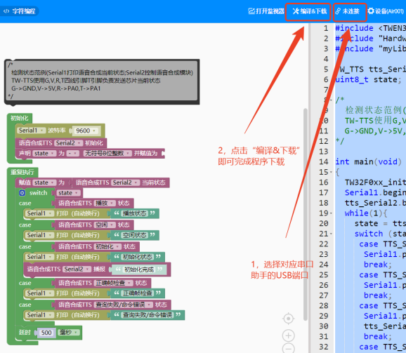 程序下载 将TW32F003主板通过TypeC数据线连接到电脑的USB端口,选择对应的USB串口 点击编译&下载即可下载程序到TW32F003主板上。下载完成后TW32会自动重启系统。