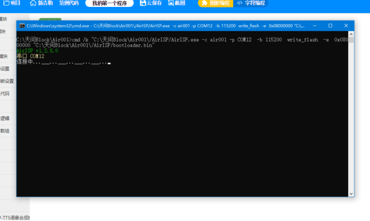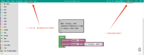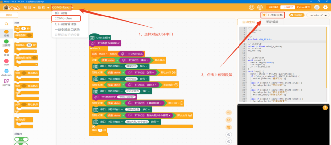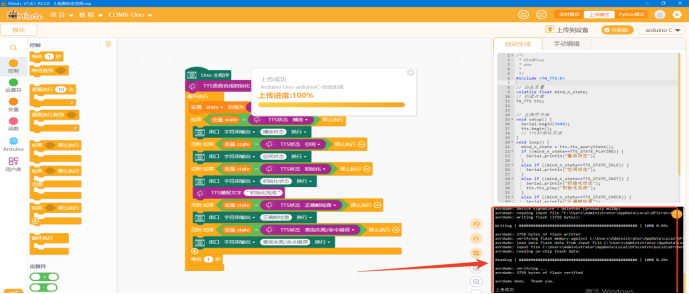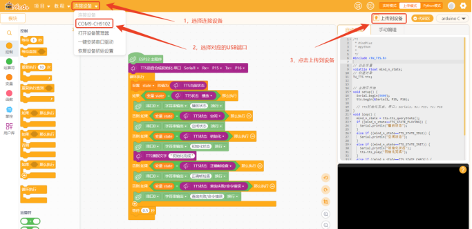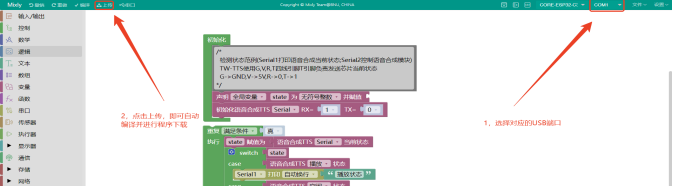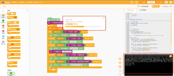 关闭cmd编写进程,返回天问Block界面,选择好USB转TTL工具的USB端口,点击“编译&下载”即可自动程序下载。