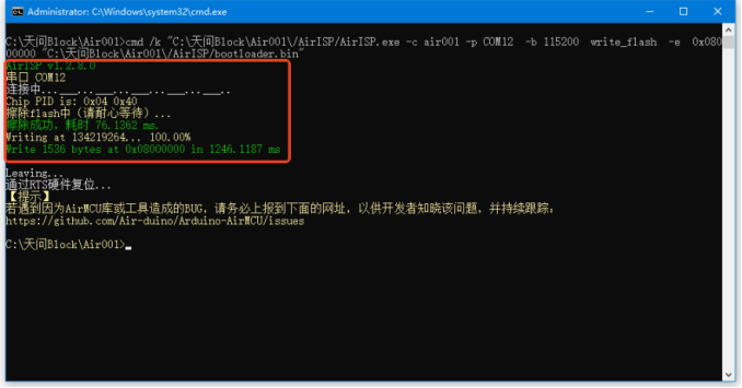 此时按下Air001开发板上的BOOT键,按住稍等1-2秒后松开BOOT键,对话框会进行自动擦除flash并进行烧写。几秒钟后完成Bootloader烧写(绿色就表示烧写成功)。