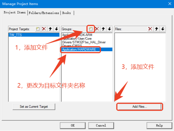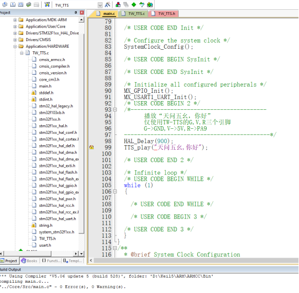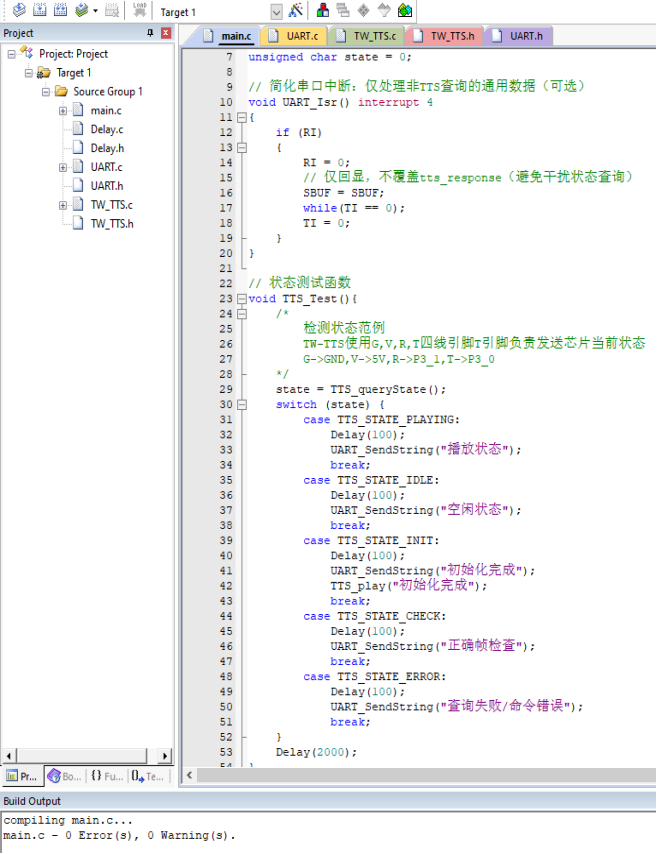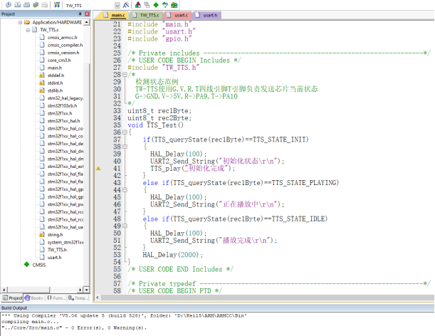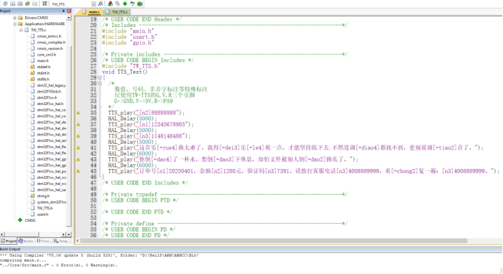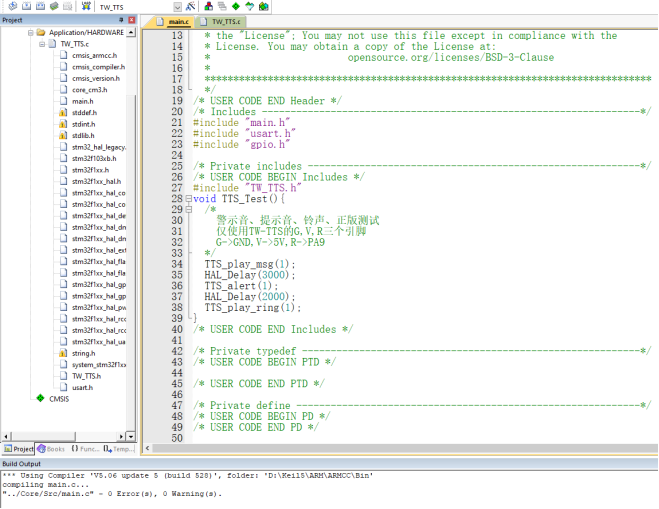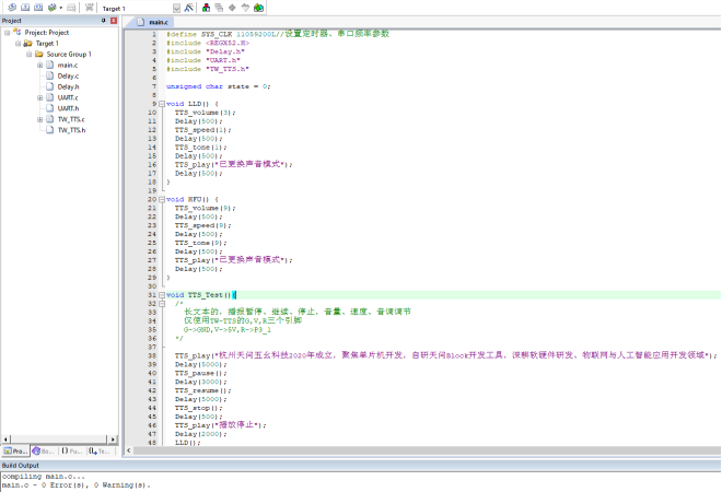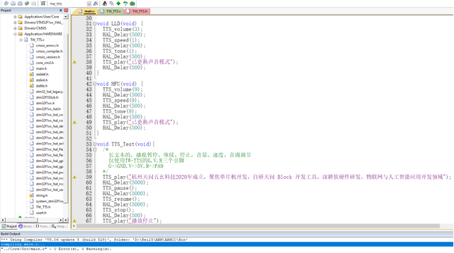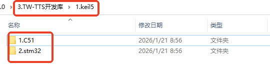 八、Keil5支持的芯片使用TW-TTS语音合成模块Keil5软件下载链接: Keil官方链接:https://www.keil.com/download/product/ 通过网盘分享的文件:Keil5 MDK.zip等4个文件 链接: https://pan.baidu.com/s/1CFitvZ3t-EBk-V5tW4-YNA?pwd=jtiw 提取码: jtiw 1、在Keil5工程中添加TW-TTS库文件从TW-TTS语音合成模块学习资料依次找到 --> TW-TTS开发库 --> keil5 --> stm32或者C51