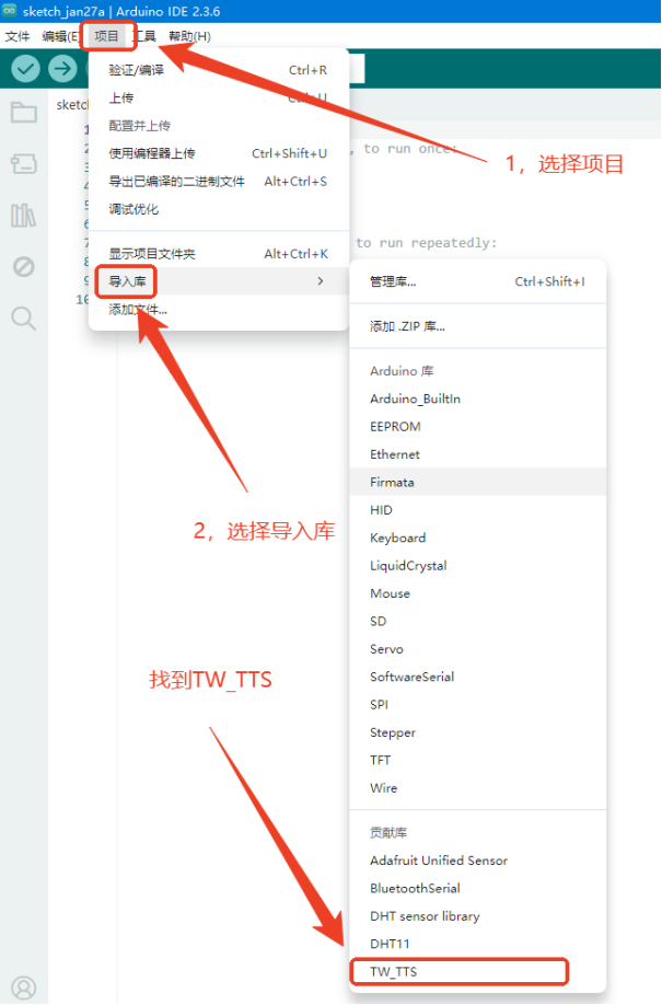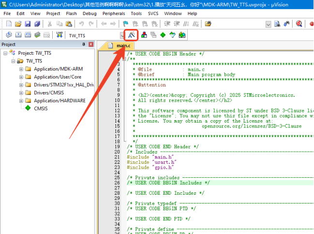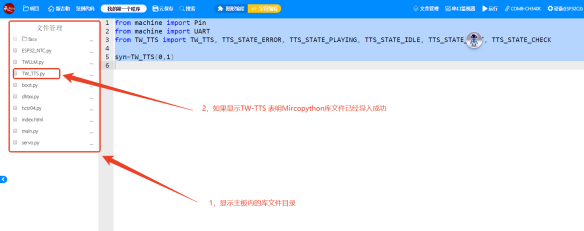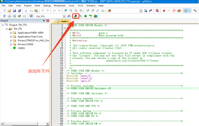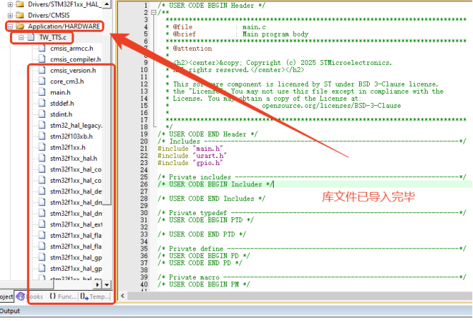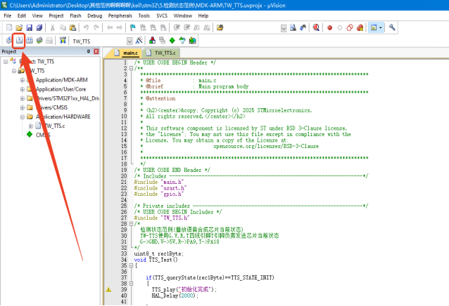 返回工程main文件界面后点击左边的库文件目录下拉,就能找到已经导入的TW-TTS库文件。