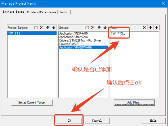选择复制到工程文件中的TTS库文件中的.c文件,点击Add后选择Close关闭窗口