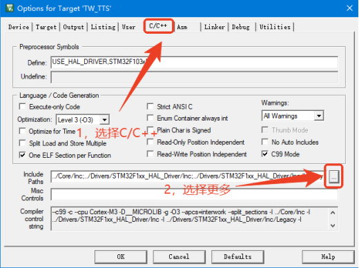 选择C/C++,点击Include Paths,增加库文件路径