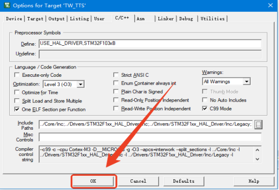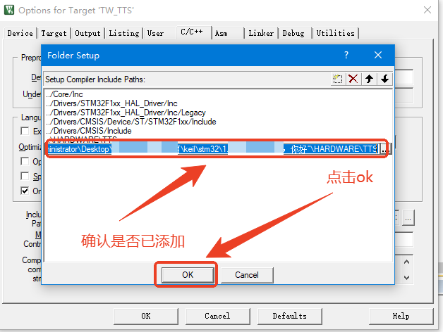返回Options for Target后再次点击OK,添加索引路径后,库文件中的.h文件会自动配置到工程文件夹中的.C目录下。