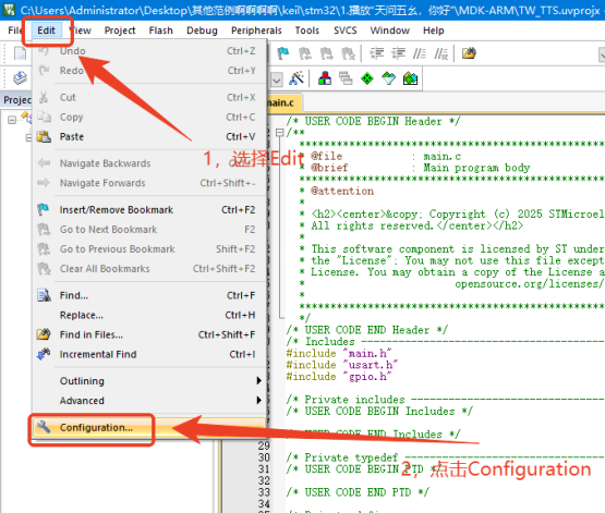 这时候已经完成了TW-TTS库文件的导入,需要更改工程的中文显示格式,防止中文显示乱码的情况。 根据Keil的版本不同可以选择UTF-8或者GB2312中文显示格式。这里是只展示GB2312中文编码添加。