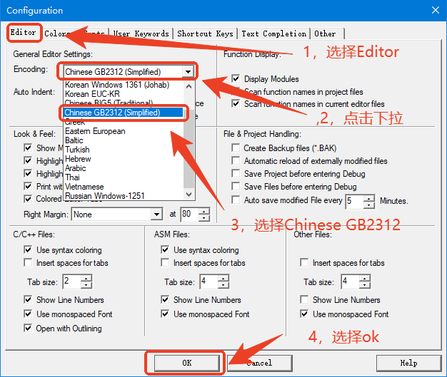 选择Edit中的Configuration后,选择好chinese GB2312编码格式并点击OK。