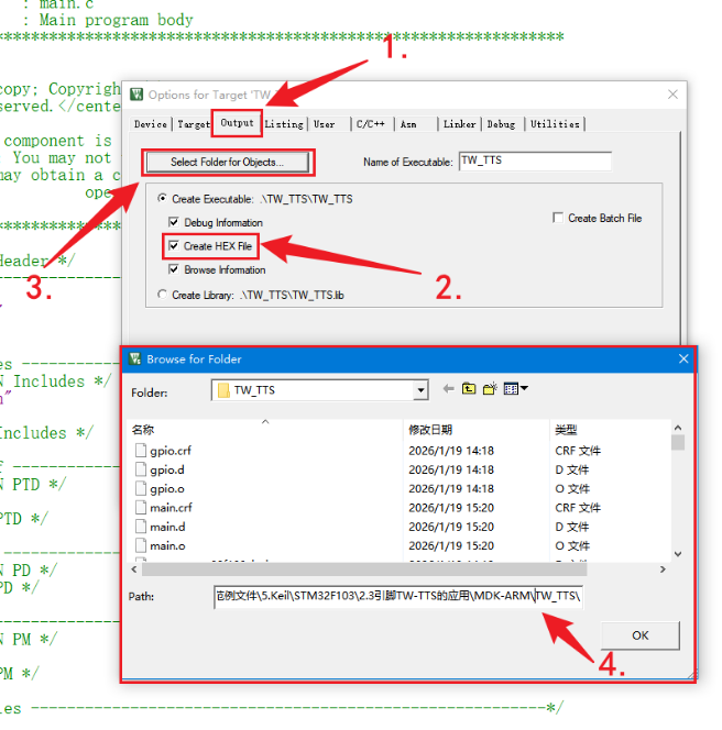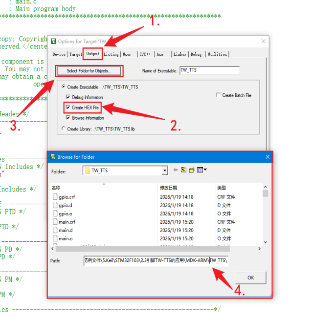 点击Output->勾选Create HEX File -> Select folder for Objects 选择保存hex文件保存路径,使用范例编译生成的hex文件也会保存这个路径中。