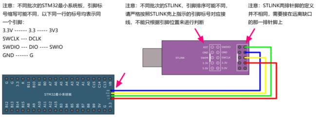STM32的 DCLK 引脚接ST-LINK的SWCLK引脚,STM32的 DIO 引脚接ST-LINK的 SWDIO 引脚。3.3引脚接ST-LINK的3.3引脚,GND引脚接ST-LINK的GND引脚。