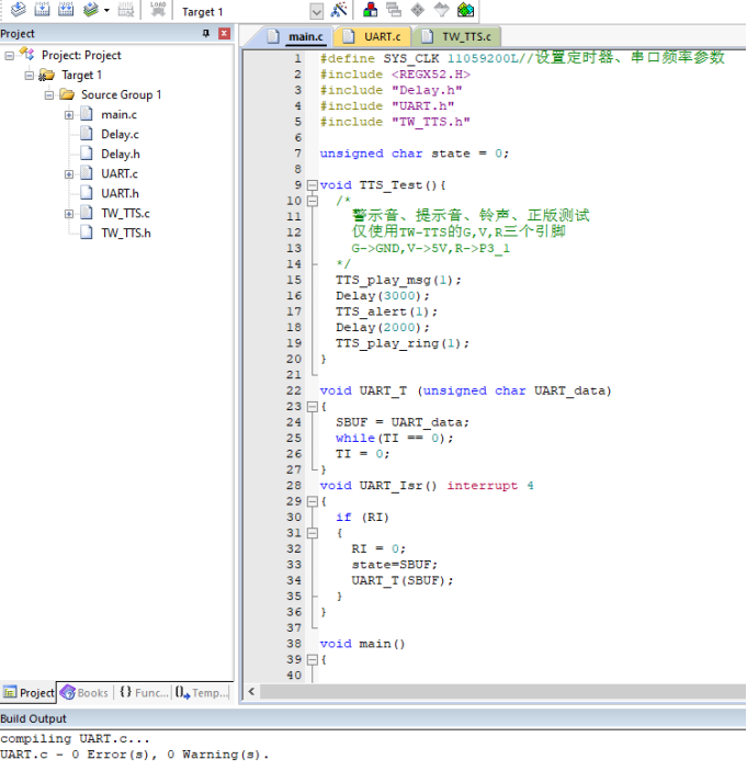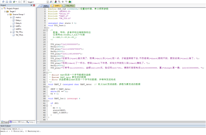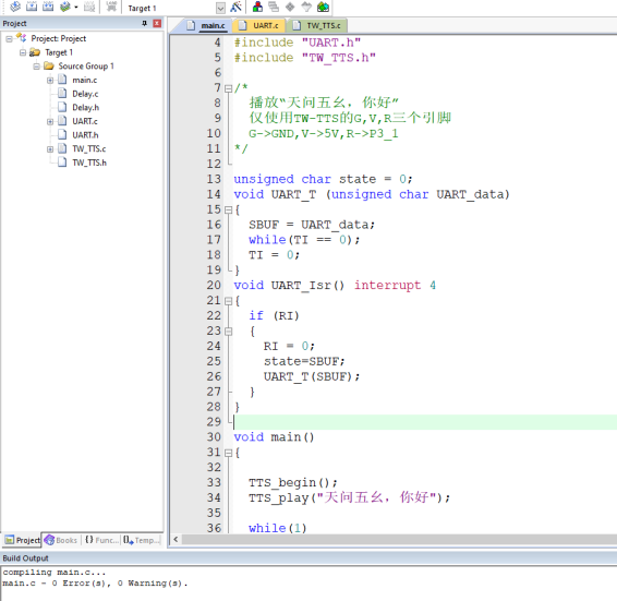 然后在Keil主界面点击 Download 进行程序下载,下载完成以后,需要手动(Reset)复位或者配置软件复位,重新运行程序。 3、C51如何使用TW-TTS语音合成模块硬件连接 无扩展板使用C51系列裸芯片时,需要在芯片的18和19引脚连接一个12M的无源晶振才可以正常使用。注意:C51串口只有TX(P3.1)和RX(P3.0),如连接TW-TTS模块的同时需要下载程序,需将TW-TTS的RX(P3.0)连接线拔掉才能正常下载程序 TTS模块5V连接到C51芯片的40引脚(VCC),TTS模块的G连接到C51芯片的20号引脚(GND);TTS模块的T连接到C51芯片的10号引脚(P3.0),TTS模块的R连接到C51芯片的11号引脚(P3.1);TTS模块的SPK+和SPK- 分别连接喇叭的+(红线)和-(黑线)。 范例代码 (1)文本播报,天问五幺,你好; 实现效果:单片机上电自动播报:天问五幺,你好