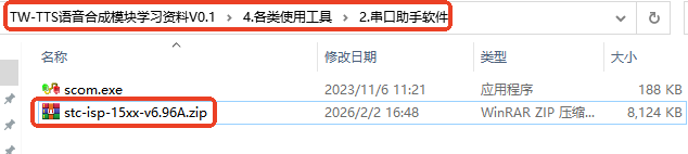 4、使用stc-isp软件进行测试将USB转TTL模块连接到电脑 --> 打开学习资料文件夹 --> 各类使用工具文件夹 --> 串口助手软件文件夹 --> 找到stc-isp.zip