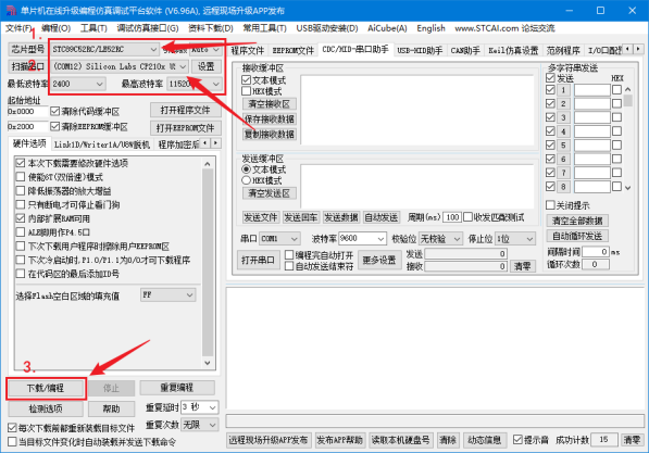 程序下载 将STC8主板通过数据线连接到电脑的USB端口,选择对应的USB端口,点击“运行”即可完成程序下载。下载完成后STC8会自动重启系统。