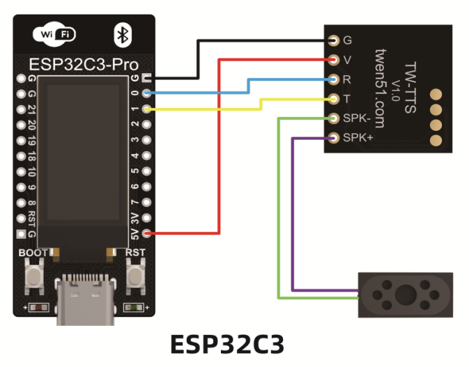 5、ESP32如何使用TW-TTS语音合成模块硬件连接 ESP32C3主板支持任意的GPIO引脚映射。ESP32C3的0(TX)引脚接TW_TTS的(R)引脚,ESP32C3的1(RX)引脚接TW_TTS的(T)引脚。5V引脚接TW-TTS的(V)引脚,G引脚接TW-TTS的(G)引脚。TW-TTS的SPK+和SPK- 分别连接喇叭的+(红线)和-(黑线)。 范例代码 (1)文本播报,天问五幺,你好; 实现效果:单片机上电自动播报:天问五幺,你好