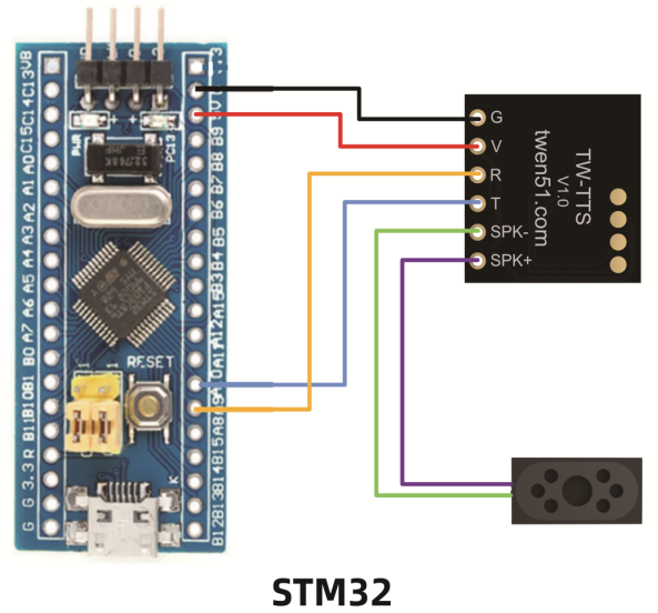 2、STM32F103C8如何使用TW-TTS语音合成模块硬件连接 STM32的PA9(TX)引脚接TW_TTS的(R)引脚,STM32的PA10(RX)引脚接TW_TTS的(T)引脚。5V引脚接TW-TTS的(V)引脚,G引脚接TW-TTS的(G)引脚。TW-TTS的SPK+和SPK- 分别连接喇叭的+(红线)和-(黑线) 范例代码 (1)文本播报,天问五幺,你好; 实现效果:单片机上电自动播报:天问五幺,你好