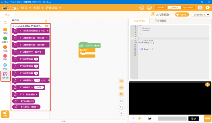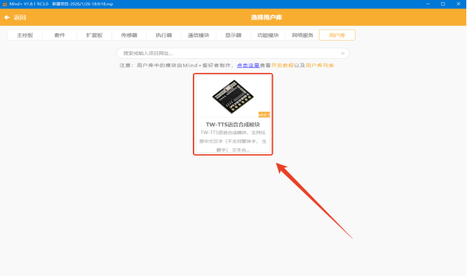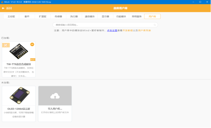 点击完成后,点击左上角的返回按钮,有安装过TW-TTS图形库,图形库有更新的时候需要移除再重新加载。 返回主界面后,在左侧代码栏下面找到并选择“扩展”,在扩展子分类的最下方找到“TW-TTS语音合成模块”并点击就可以看到TW-TTS的图形块。