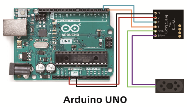 3、Arduino Uno如何使用TW-TTS语音合成模块硬件连接 Uno的1(TX)引脚接TW_TTS的(R)引脚,Uno的0(RX)引脚接TW_TTS的(T)引脚;这个串口同样是程序下载的默认串口,程序下载前需要将RX线拔掉再进行下载;5V引脚接TW-TTS的(V)引脚,G引脚接TW-TTS的(G)引脚;TW-TTS的SPK+和SPK- 分别连接喇叭的+(红线)和-(黑线)。 范例代码 可直接将范例代码复制粘贴到Arduino IDE的代码框中 (1)文本播报,天问五幺,你好; 实现效果:单片机上电自动播报:天问五幺,你好。 - #include <TW_TTS.h>