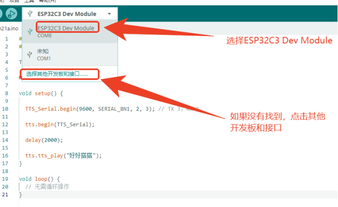 如果串口处没有出现Arduino Uno,需要点击“选择其他开发版和接口”根据下图所示找到并选择ESP32C3 Dev Module,然后点击“确定”。