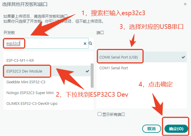 如果串口处没有出现ESP32C3 Dev Module,需要点击“选择其他开发版和接口”根据下图所示找到并选择ESP32C3 Dev Module,然后点击“确定”。