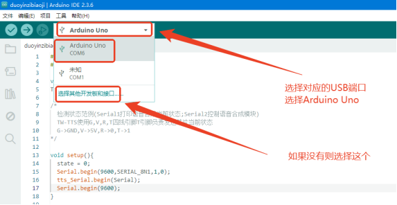 复制代码程序下载 将Uno主板通过数据线连接到电脑的USB端口,选择对应的USB串口,串口处出会正常显示Arduino Uno